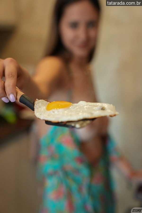 Essa linda e preparou o café da manhã bem à vontade no apartamento, com os seios empinados e lindos à mostra. Com o calor, ficou só de calcinha, toda combinada.